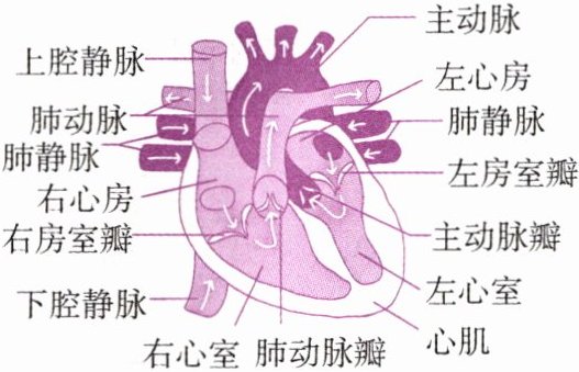 。血液在心脏中只能按左心房→左心室→主动脉和右心房→右心室→肺动脉这个方向流动而不能倒流,这是因为房室瓣只能朝向心室打开,动脉瓣只能朝向动脉打开。心脏中的每个腔都分别与相应的血管相连:①左心室与主动脉相连;②右心室与肺动脉相连;③左心房与肺静脉相连;④右心房与上、下腔静脉相连。