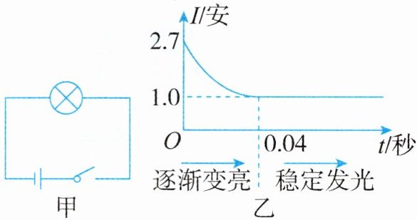 某兴趣小组的同学为了找到原因,将一个标有“36V 25W”字样的小灯泡接在电压为12伏的恒压电源上(如图甲所示),闭合开关的瞬间($t= 0$)利用传感器记录电路中电流随时间的变化情况(如图乙所示),利用高速摄影技术可以观察到前0.04秒灯丝经历了从不发光、微微发光到逐渐变亮的过程;从第0.04秒后灯泡逐渐变为稳定发光。下列说法中,错误的是 (
