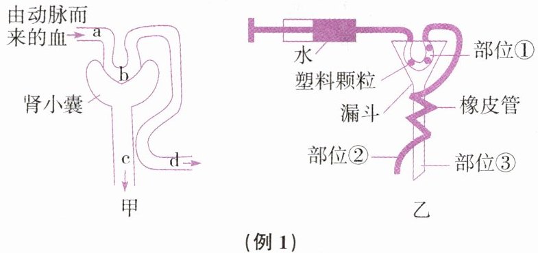 【例1】 小金对照图甲所示的肾单位模型图,制作了图乙所示的肾单位实物模型,以注意点血液经过肾小球的滤过作用和肾小管的重吸收作用后,部分尿素和尿酸等代谢废物随尿液排出体外。模拟肾小球的滤过作用和肾小管的重吸收作用,下列说法中,正确的是 (