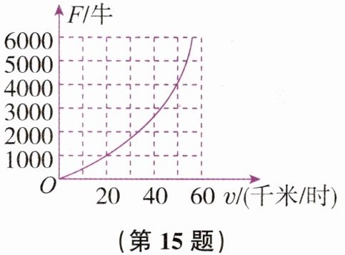15. 某新型混合动力汽车启动后,内燃机不工作,蓄电池向车轮输送能量。当需要高速行驶或蓄电池电能过低时,内燃机启动,既可以向车轮输送能量,又可以给蓄电池充电,汽车所受阻力与车速的关系如图所示。某次由内燃机提供能量进行测试,汽车以 50 千米/时的速度在平直公路上匀速行驶了 0.5 小时,测试结束时蓄电池的电能增加$0.8×10^{7}$焦。计算:
