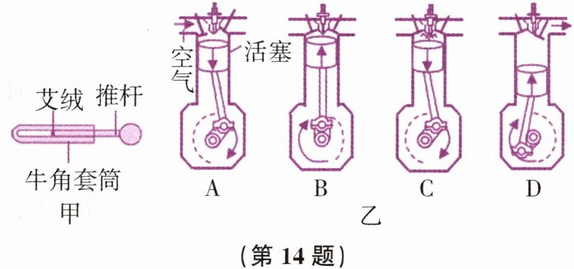14. 如图甲所示为我国古代发明的一种取火器——火绒,把木制推杆快速推入牛角套筒时,杆前端的艾绒立刻燃烧起来。如图乙所示为小科建构的汽油机工作原理图。