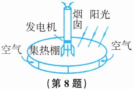 8. 如图所示为我国在宁夏建造的一座试验性发电站的示意图。阳光穿过透明的集热棚棚顶使棚内空气变热,热空气从烟囱中向上冲,带动发电机发电。这种发电站利用的能源是