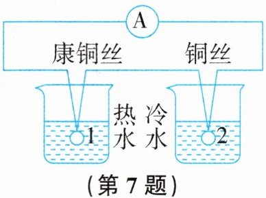 7. 如图所示,两种不同的金属丝组成了一个闭合回路,将触头1置于热水杯中,触头2置于冷水杯中,此时回路中电流表指针就会发生偏转,这就是温差电现象。此过程中