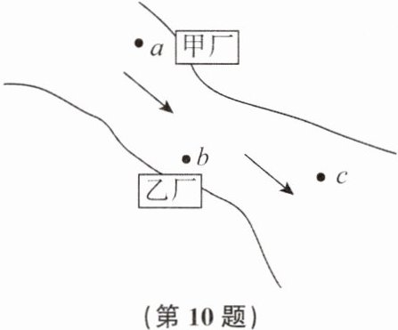 10. 甲、乙两化工厂分布如图所示,箭头代表水流方向。如果在a处取得水样,经检测,含有的阴离子是$OH^{-}$、$SO_{4}^{2-}$。在c处取得水样,经检测,$pH= 7$,且只含有少量NaCl。若已知b处水中含有的物质是$BaCl_{2}$、HCl,则a处水样含有的阳离子是 (