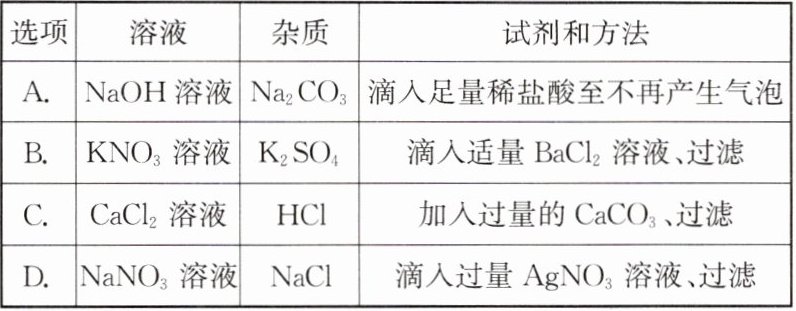 7. 为了除去溶液中的少量杂质,下列所用试剂和方法中,正确的是 (