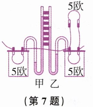 7. 如图所示为探究“电流通过导体时产生热量的多少跟什么因素有关”的实验装置。两个相同的透明容器中密封着等量且初温相同的空气,甲、乙两U形管中液面的初始状态是等高相平,通电一段时间后液面的高度如图所示。