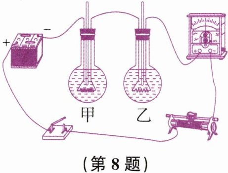 8. 如图所示,在两个相同的烧瓶内装满等量煤油,瓶塞上各插入一根粗细相同的玻璃管,瓶内装入粗细、材料相同的电阻丝$R_{甲}和R_{乙}$,$R_{甲}的长度大于R_{乙}$。闭合开关,经过一段时间$t_{1}$,玻璃管甲液面上升高度$h_{甲}$