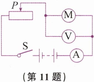 11. 如图所示为小叶测量一个小电扇的机械效率时所用的电路图,小叶调节滑动变阻器的滑片至适当位置,再抓住电扇的叶片,使电扇的电动机不会转动,合上开关,读出电压表和电流表的示数分别为$U_{1}和I_{1}$;接着放开电扇叶片,让电动机转动,读出电压表和电流表的示数分别为$U_{2}和I_{2}$;已知电源电压为U并保持不变。请回答下列问题: