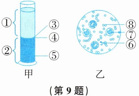 9. 如图甲所示为加入抗凝剂的人体血液静置一段时间后出现的分层现象,如图乙所示为在显微镜下观察到的血细胞涂片。