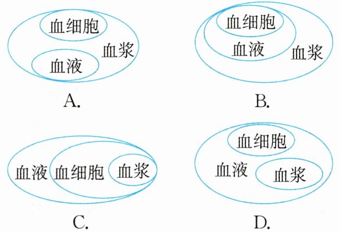 2. 下列血液、血浆、血细胞三个概念的关系图中,正确的是 (