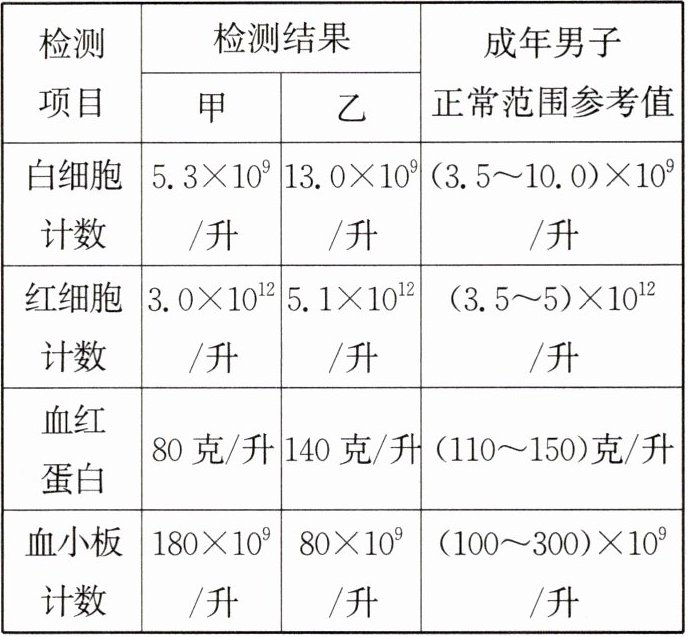 (1)医生依据甲血液检查报告中红细胞和血红蛋白的数值都偏低,判断他可能患有