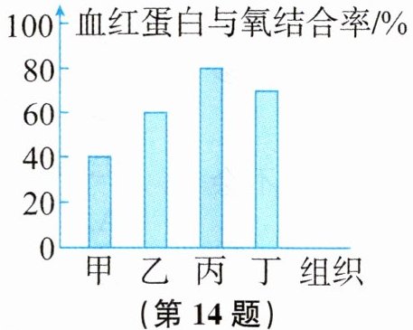 14. 如图所示为甲、乙、丙、丁四种组织中血红蛋白与氧的结合情况。甲、乙、丙、丁四种组织中,呼吸作用最旺盛的是 (