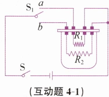 - 互动题4-1:小强利用家庭实验室中的器材,设计了一个可调节功率的简易“电饭锅”,如图所示,电源电压为$6$伏,电阻丝$R_{1}= 5$欧,$R_{2}= 15$欧,$a$、$b$是两个触点。闭合开关$S$,当开关$S_{1}$接通触点