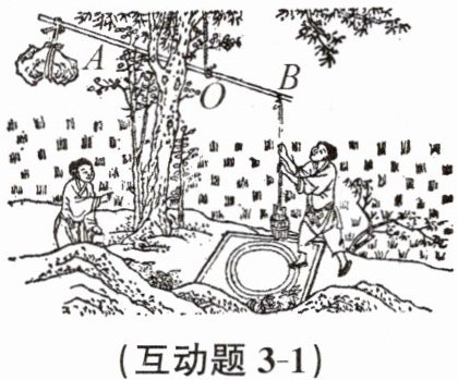 - 互动题3-1:如图所示为我国传统提水工具“桔槔”,用绳子系住一根直硬棒的O点作为支点,A端挂有重为40牛的石块,B端