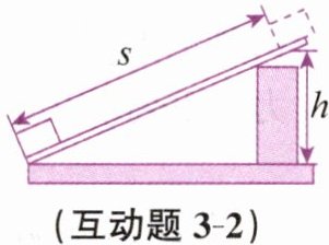 - 互动题3-2:将一个重$240$牛的物体匀速推到斜面顶端,人沿斜面向上的推力为$120$牛,如图所示,物体沿斜面移动的距离$s = 3$米,上升的高度$h = 1.2$米,则推力所做的总功是