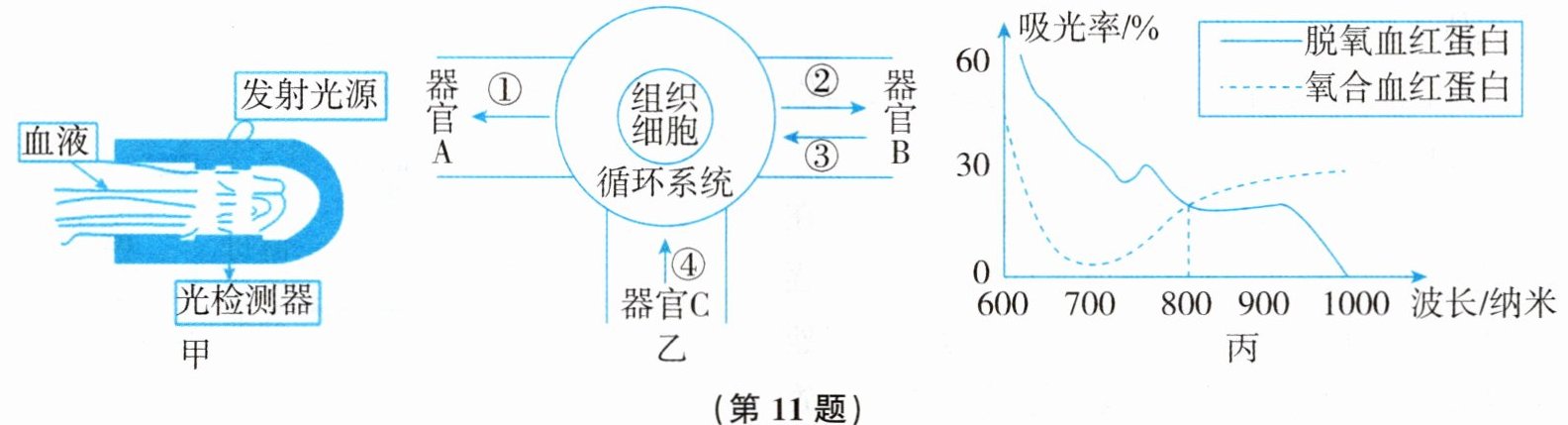 。(3)如图丙所示为氧合血红蛋白和脱氧血红蛋白对于不同波长的光的吸收率关系图,请分析该发射光源不能选取的波长是多少纳米并据图进行解释。