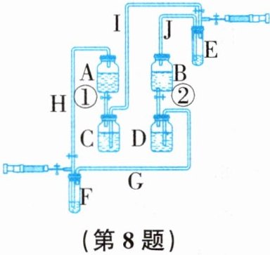 8. 如图所示为自制的人体血液循环模型。其中A、B、C、D是四个塑料瓶,共同组成了心脏,D代表左心室;E和F是两支试管,代表某些器官内的毛细血管网。手动挤压该模型中的塑料瓶,产生的压力能使瓶中的液体在密闭管道中循环流动。下列关于此模型的说法,不正确的是 (