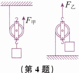 4. (2024·金华市永康市模拟)小乐用如图所示的两种方式竖直匀速提升某物体,且都使物体上升了$2$米。已知物体重$200$牛,滑轮重$40$牛,提升时的拉力分别为$F_{甲}和F_{乙}$。若不计绳重和摩擦,则在提升过程中(