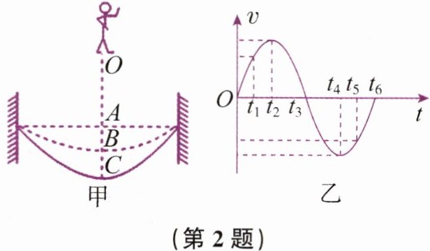 2. (2024秋·宁波市镇海区期中)蹦床是一种集艺术性和竞技性于一体的运动,深受广大青少年喜爱。图甲为蹦床运动简化示意图,$O$点是小蛟由静止开始自由下落的起始位置,$C$点是小蛟到达的最低点。从高处开始下落到弹回的整个过程中,他的运动速度随时间变化的图像如图乙所示(速度为负值,表示运动方向向上,整个过程中忽略空气阻力),则下列说法中,正确的是(