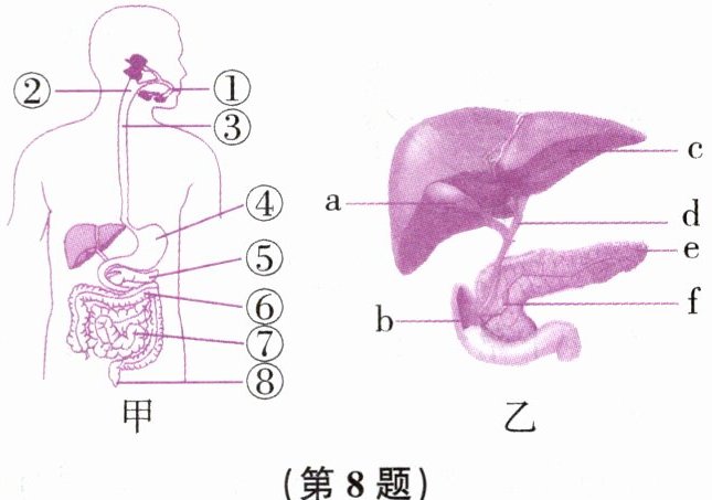 8. 如图甲所示为消化系统结构模式图,如图乙所示为部分器官示意图。