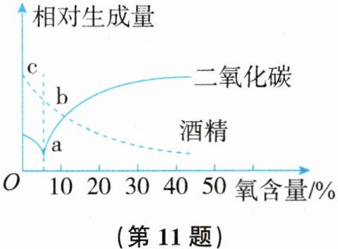 11. 如图所示为用葡萄糖培养液培养某种单细胞真菌时,测得的不同氧含量条件下酒精和二氧化碳的相对生成量。分析图中曲线不能得出的结论是 (