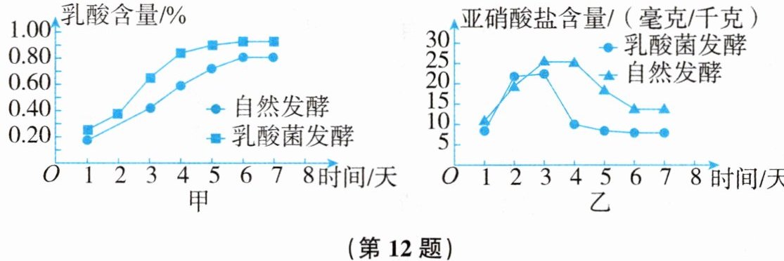 转化为乳酸。(3)科研人员对乳酸菌发酵和自然发酵(自然发酵状态下存在其他杂菌)生产的泡菜进行了7天对比实验,结果如图甲、乙所示(注:亚硝酸盐含量过高具有致癌性)。由图甲可知乳酸菌发酵产生的乳酸含量