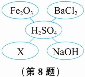 8. 某同学在学习了硫酸的化学性质后,初步归纳出稀硫酸与其他物质相互反应的关系,如图所示(“—”表示相连的两种物质间能发生反应,五个圈中的物质属于不同的类别)。