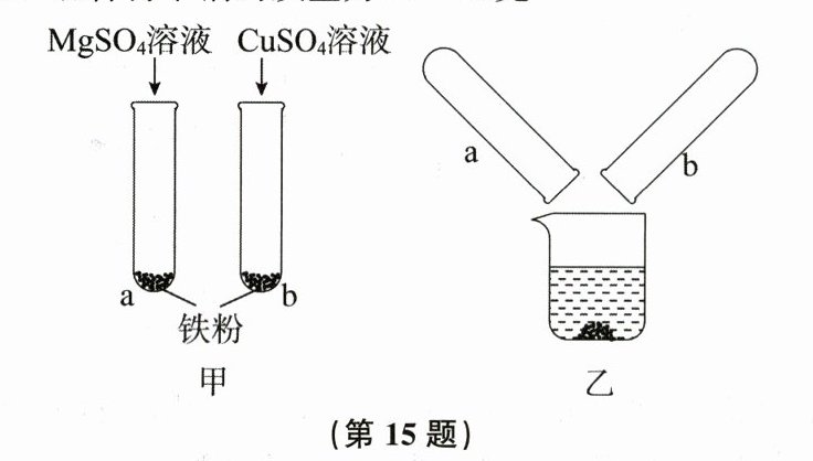 15. 小柯为比较Mg、Fe、Cu三种金属的活动性顺序,进行了如图甲所示的实验,实验后把两试管中的物质倒入烧杯中(如图乙所示),发现烧杯内的红色固体明显增多,充分反应后过滤,滤液中含有的金属离子可能的组成有 (