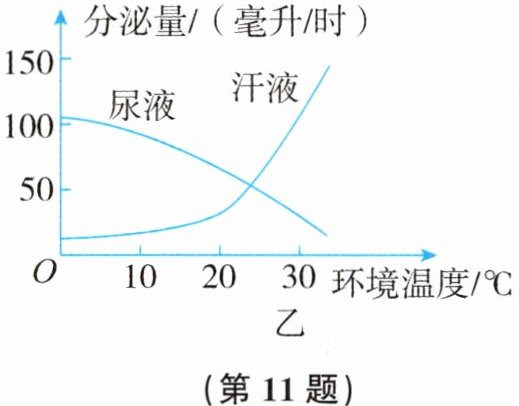(写出两个)。(3)如图乙所示为某人汗液和尿液量随环境温度变化的曲线图。结合图甲分析,他在高温环境中汗液分泌量增多,未及时补充水分时,肾小管对水分的重吸收作用会