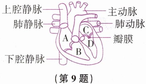 的直径。它经过上腔静脉时,最先进入字母A代表的右心房