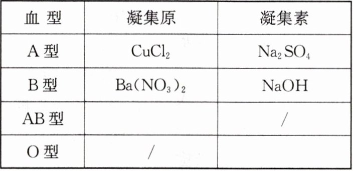 12. 输血是对失血过多患者最有效的急救措施,输血时以输同型血为主。小明想要模拟血液以及血清凝集反应,选择如表所示的化学试剂(反应产生沉淀模拟血液凝集反应)进行探究: