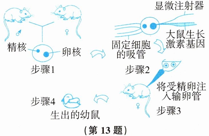 13. 如图所示为转基因超级鼠(即把小鼠培育成大鼠)产生的详细过程示意图。