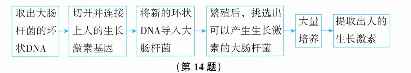14. 生长激素具有促进人体生长的作用,在临床上可以用来治疗侏儒症。科学家把人的生长激素基因导入细菌,培育能够生产生长激素的“工程菌”。如图所示为培育“工程菌”的过程图解,请据图分析并回答下列问题: