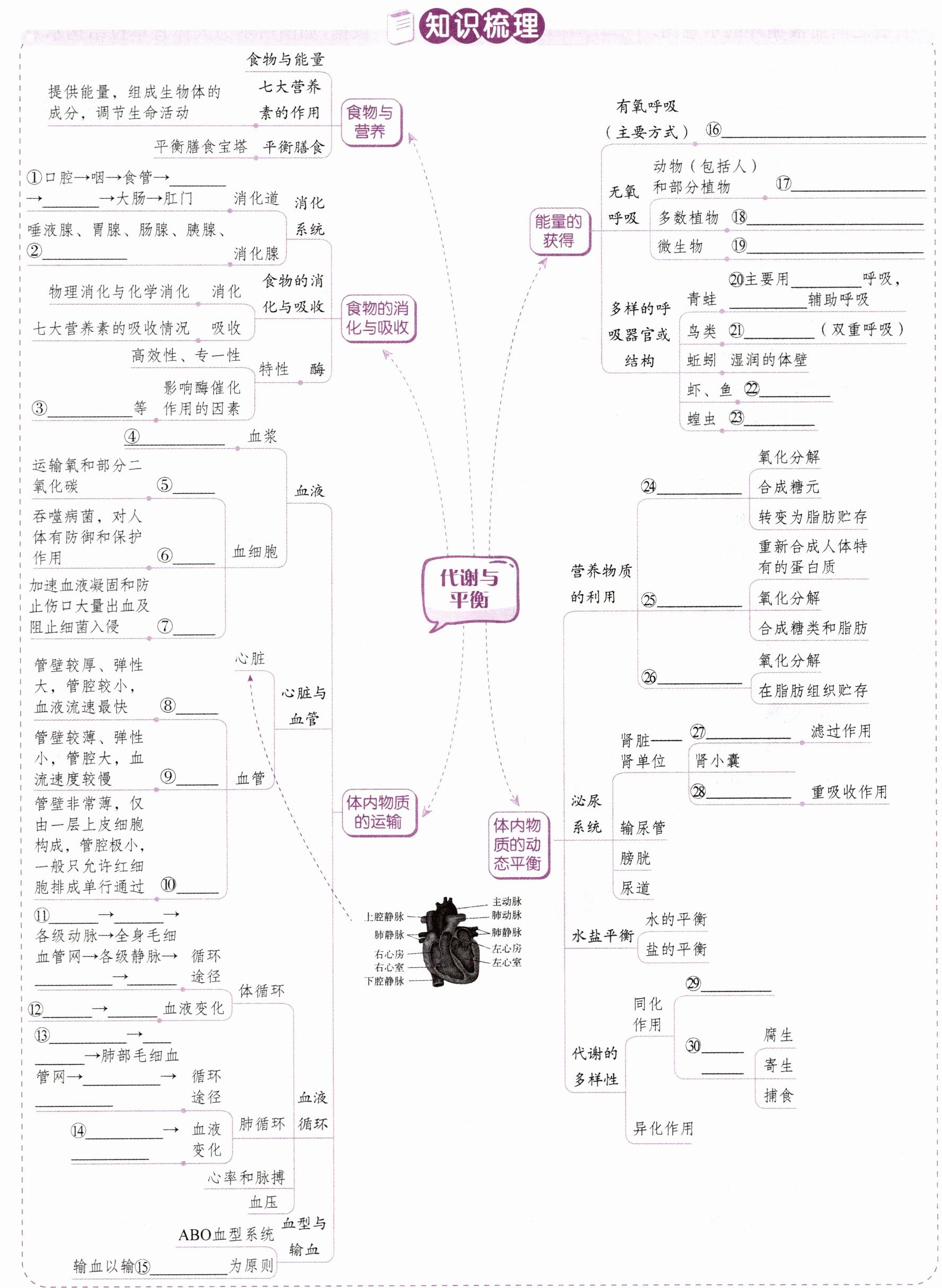 ①胃 小肠 ②肝脏 ③温度、酸碱度 ④运载血细胞、运输营养物质和代谢产物 ⑤红细胞 ⑥白细胞 ⑦血小板 ⑧动脉 ⑨静脉 ⑩毛细血管 ⑪左心室 主动脉 上、下腔静脉 右心房 ⑫动脉血 静脉血 ⑬右心室 肺动脉 肺静脉 左心房 ⑭静脉血 动脉血 ⑮同型血 ⑯有机物+氧气→二氧化碳+水+能量 ⑰葡萄糖→乳酸+能量(少量) ⑱葡萄糖→酒精+二氧化碳+能量(少量) ⑲发酵 ⑳肺 皮肤 ㉑肺 ㉒鳃 ㉓气管 ㉔糖类 ㉕蛋白质 ㉖脂肪 ㉗肾小球 ㉘肾小管 ㉙自养 ㉚异养