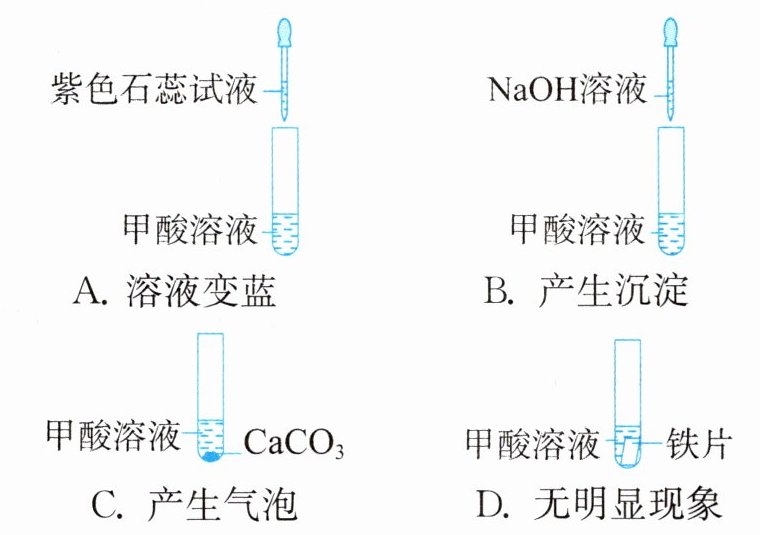 10. 蚊子或蚂蚁叮咬人体后会向人体注射蚁酸,使皮肤红肿、瘙痒。蚁酸的俗名是甲酸,化学式为HCOOH,在水中能电离出$H^{+}$,下列与甲酸有关的实验现象的描述,正确的是(