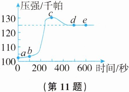 11. 将表面布满铁锈(铁锈的主要成分是$Fe_{2}O_{3}$)的铁钉放入盛有稀硫酸的密闭容器中,用压强传感器测得容器内压强随时间变化的曲线如图所示。下列分析中,正确的是(