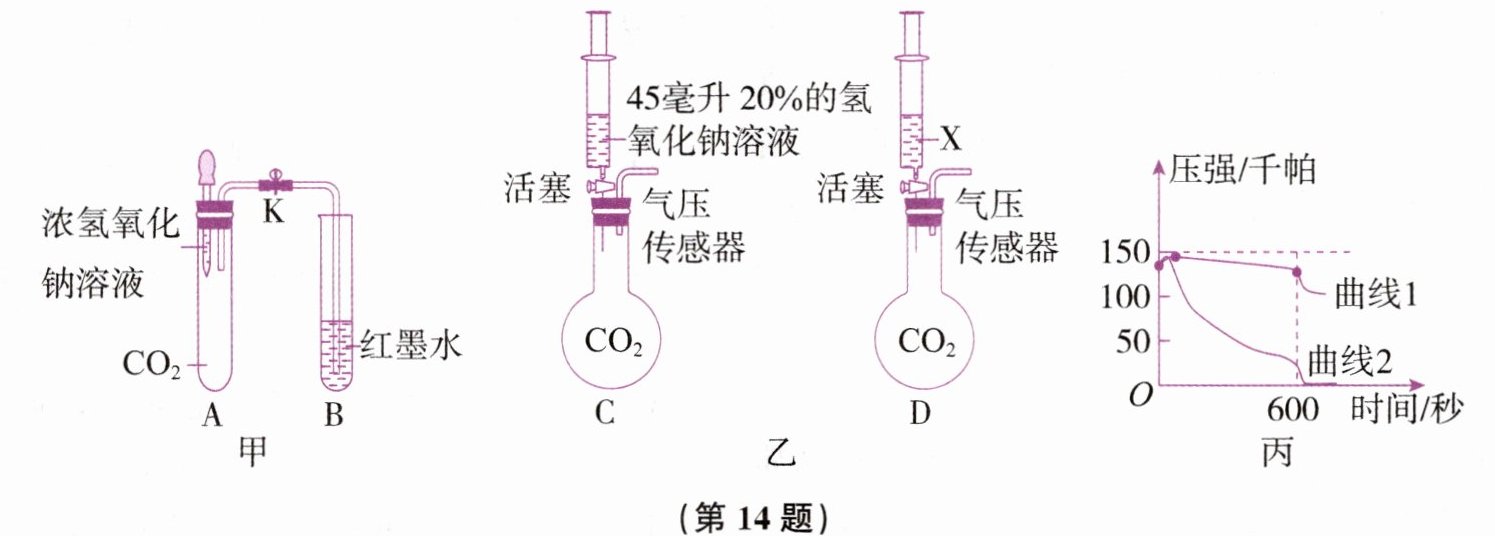 (1)小诚设计图甲所示的装置进行实验,将氢氧化钠溶液滴入试管中,一段时间后打开止水夹K,观察到B导管中红墨水液面上升。小施认为此现象不足以证明${NaOH}与{CO_{2}}$发生了反应,他的理由是______