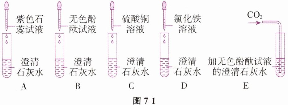 根据已学的碱的一些共性知识,设计探究氢氧化钙化学性质的实验方案(用操作示意图7-1表示),并进行操作,填写相应的实验现象。