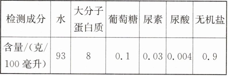 (2)如表所示为某患者的肾小囊提取液成分检测表,其中能证明该患者肾小球受损的证据是