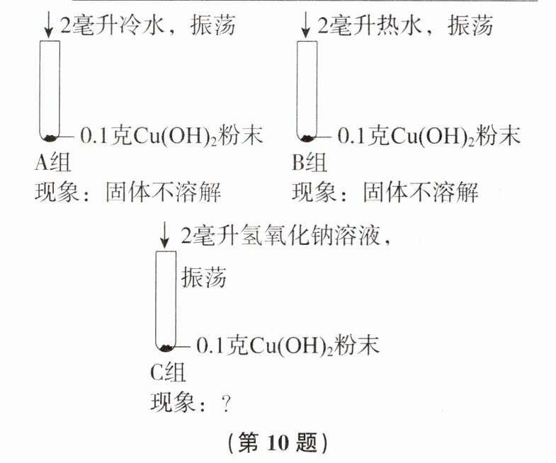 10. (2024秋·湖州市长兴县期末)小科学习了碱和盐的性质后,将少量硫酸铜溶液滴入2毫升氢氧化钠溶液中,没有观察到预期的蓝色絮状沉淀,这是为什么呢?