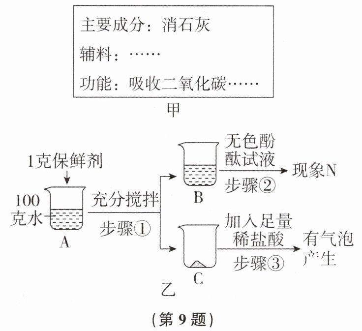 9. (2023秋·台州市三门县期末)使用果蔬保鲜剂是果蔬保鲜的一种方法。如图甲所示为某果蔬保鲜剂的部分说明,该保鲜剂使用一段时间后成分会有怎样的变化呢?某同学取一包使用一段时间后的保鲜剂按图乙所示的步骤进行实验。(辅料不参与反应)