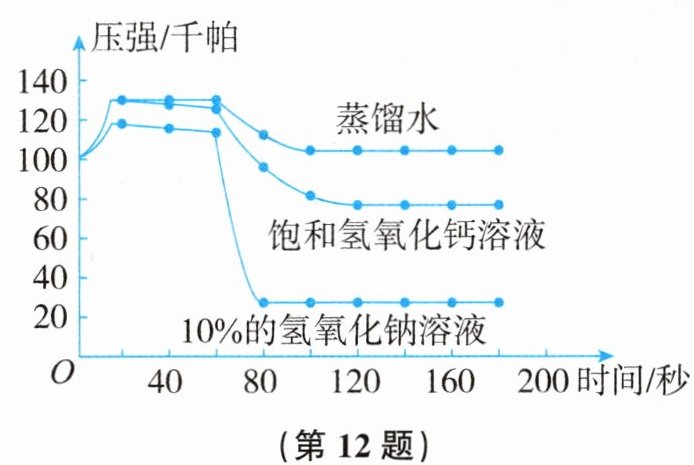 12. 为了比较氢氧化钠和氢氧化钙溶液吸收$CO_2$的效果,小科分别向集满$CO_2$的烧瓶中注入等量蒸馏水、饱和氢氧化钙溶液和10%的氢氧化钠溶液,60秒后振荡烧瓶,并测得烧瓶内气体压强与时间的关系如图所示。下列说法中,错误的是(