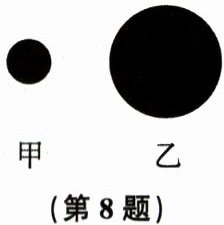 8. 小金在水平地面上铺一张白纸,将一只皮球表面涂黑,使其先后从$h_1、$$h_2$高度处由静止自由下落,分别在纸上留下黑色圆斑甲、乙,如图所示。下列关于$h_1、$$h_2$大小的判断,正确的是(