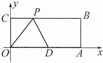 4. (西宁中考题)如图,在平面直角坐标系中,$O$为坐标原点,四边形$OABC$是矩形,点$A$,$C的坐标分别为A(10,0)$,$C(0,4)$,点$D是OA$的中点,点$P为线段BC$上的点。小明同学写出了一个以$OD为腰的等腰\triangle ODP的顶点P的坐标(3,4)$,请你求出其余所有符合这个条件的$P$点坐标。