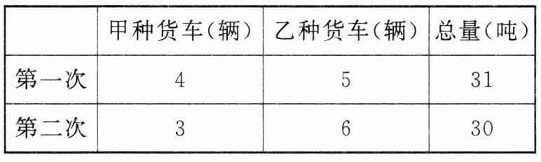 依题意得$\begin{cases}4x + 5y = 33\\4x + 3y = 25\end{cases}$,解得$\begin{cases}x = 4\\y = 3\end{cases}$,答:甲种货车每辆能装货4吨,乙种货车每辆能装货3吨.