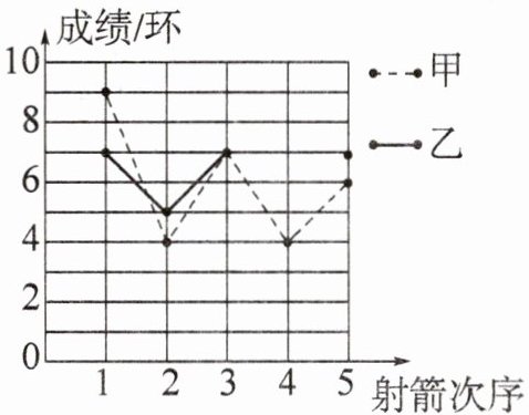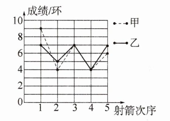 例 某社区准备在甲、乙两位射箭爱好者中选出一人参加集训,两人各射了$5$箭,他们的总成绩(单位:环)相同。小宇根据他们的成绩绘制了如下尚不完整的统计图表,并计算了甲成绩的平均数和方差(见小宇的作业)。