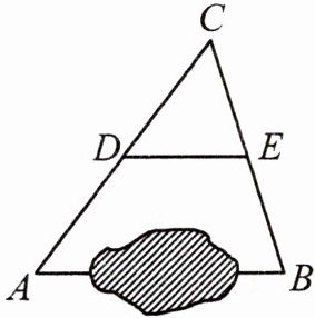 3. (盐城中考题)如图,$A$,$B$ 两地间有一池塘阻隔,为测量 $A$,$B$ 两地的距离,在地面上选一点 $C$,连接 $CA$,$CB$ 的中点 $D$,$E$. 若 $DE$ 的长度为 $30\mathrm{m}$,则 $A$,$B$ 两地的距离为____$\mathrm{m}$.