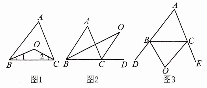 探究 3:如图 3 中,$ O $ 是外角 $ ∠DBC $ 与外角 $ ∠ECB $ 的平分线 $ BO $ 和 $ CO $ 的交点,则 $ ∠BOC $ 与 $ ∠A $ 有怎样的关系?(只写结论,不需证明)
