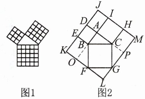 1. 勾股定理是几何中的一个重要定理.在我国古算书《周髀算经》中就有“若勾三,股四,则弦五”的记载.如图1是由边长相等的小正方形和直角三角形构成的,可以用其面积关系验证勾股定理.图2是由图1放入矩形内得到的,$\angle BAC = 90^{\circ}$,$AB = 3$,$AC = 4$,点$D$,$E$,$F$,$G$,$H$,$I都在矩形KLMJ$的边上,则矩形$KLMJ$的面积为____.