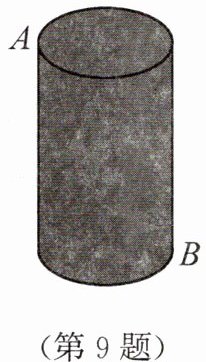9. 如图,一圆柱高$8\mathrm{cm}$,底面半径$2\mathrm{cm}$,一只蚂蚁从点$A爬到点B$处吃食,要爬行的最短路程是____$\mathrm{cm}$.($\pi取3$)